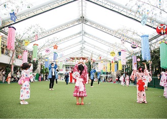 両日、雨となったが、ドーム型園庭には、やぐらが建てられ縁日や踊りを楽しむ園児たちの様子が見られた。この園庭は、天候で行事が中止とならないよう小山靖昭理事長が23年前に建てたもの。小山布由奈園長は「心の成長のために行事がある。日本の伝統を大切にする心が育まれれば」と話した。