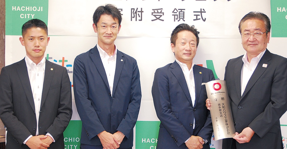 今年5月30日まで、富士森公園野球場の命名権の契約をしていた大和ハウス工業株式会社がこのほど、同球場にモニュメントクロックを寄付した。7月20日、石森孝志市長から同社南多摩支店(南大沢)支店長の榎本佳明さんに感謝状が手渡された。