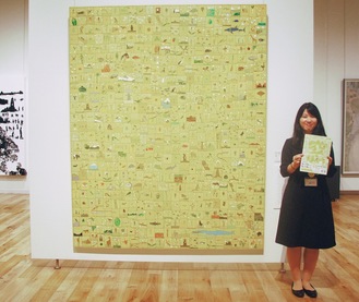 今回の企画展を担当した同館学芸員の橘田梢さんは、「絵画から景色が広がり、探検をしてもらうような内容にしました」と話す。企画展のメインとなるのは麻生隆悟さんの作品「窓」(2001年)。150号のキャンバスに人や昆虫、ナスカの地上絵、空に浮かぶ寿司など約580の「窓」が描かれている。