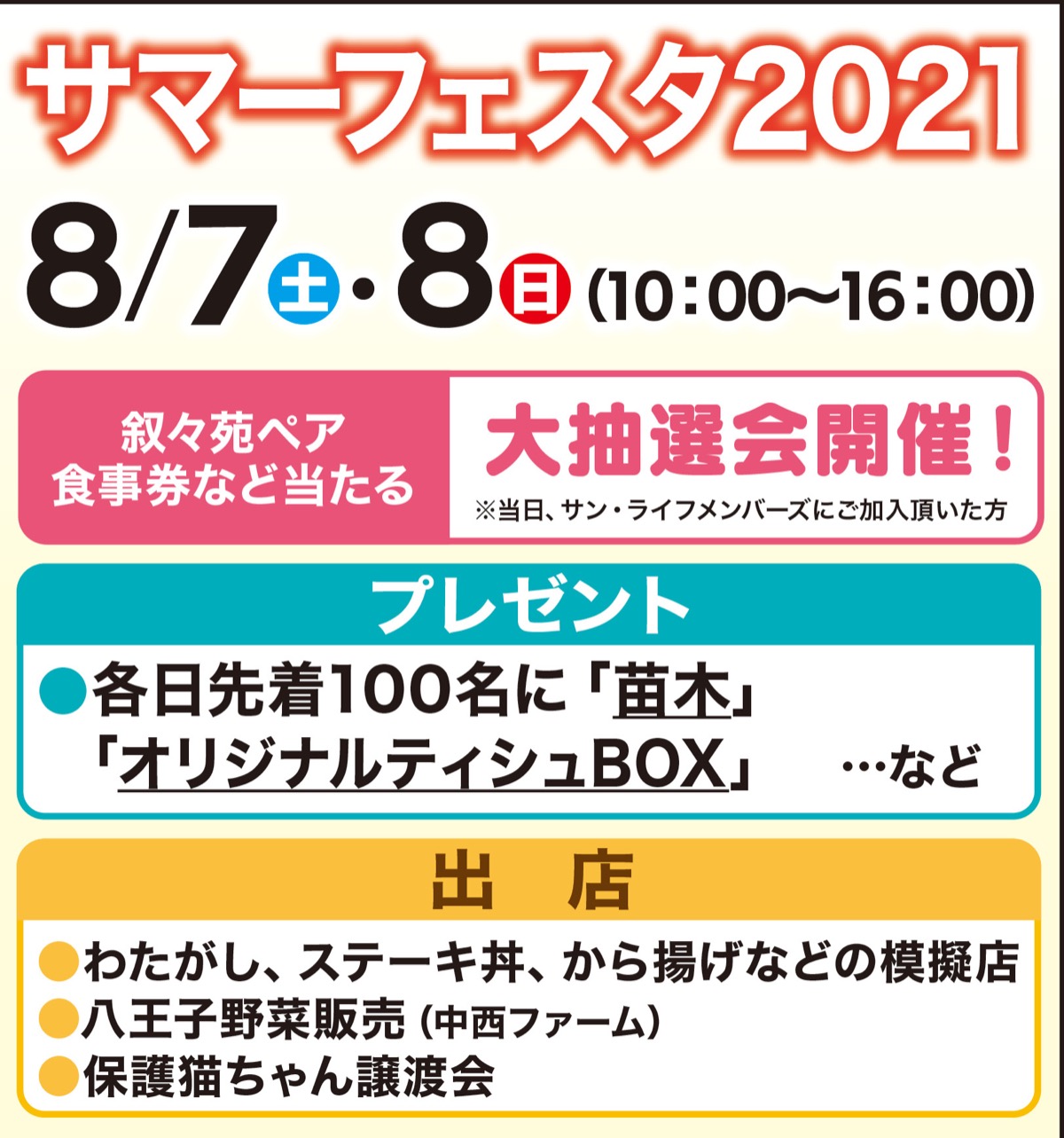 主催する冠婚葬祭事業にあたるサン・ライフグループの担当者は「親子三世代で楽しめる催し。家族そろってお越し下さい」と話している。イベント関する問い合わせは同グループ【電話】042・645・0311へ。