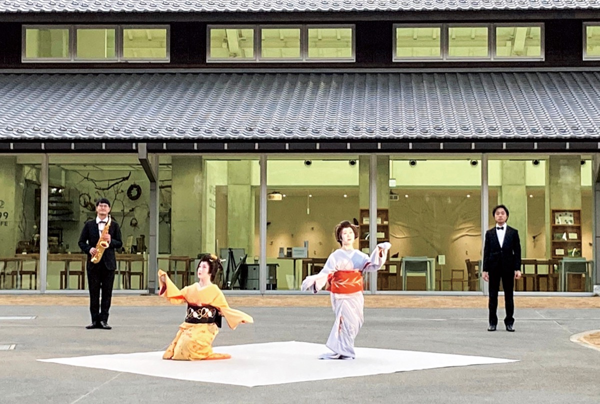 高尾町の高尾599ミュージアム前の広場で若者の歌声、演奏に合わせ芸者衆が舞う。楽曲は「アヴェマリア」と「ふるさと」。動画は、同団体のユーチューブチャンネル、下記の二次元のコードから見ることができる。