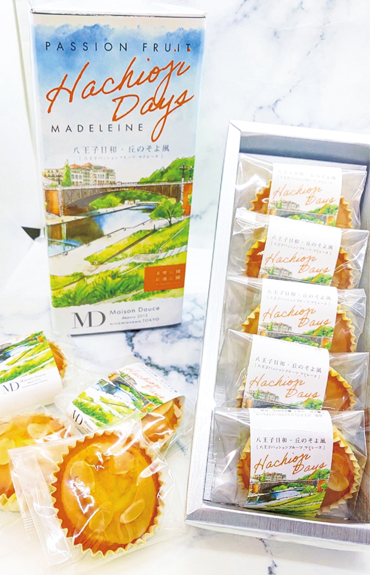 新商品は八王子産のパッションフルーツを使用したマドレーヌ「八王子日和・丘のそよ風」=写真(同店提供)。オーナーシェフの伊藤文明さんによると「しっとりと、そしてほどけるような食感のライム風味のマドレーヌ生地に、程よい酸味のパッションフルーツのコンフィチュールとパッションのグラス(糖衣掛け)。爽やかなそよ風のような香り」のスイーツという。「(地産地消で)地域貢献になればと思いました。八王子銘菓になるものを作りたかったです」