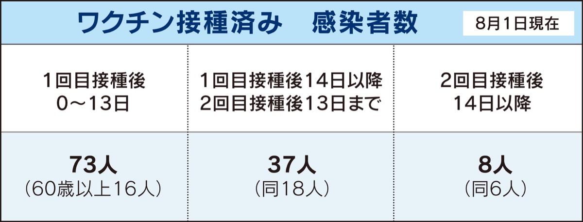 接種した人のうちで、感染した人(8月1日時点)は「1回目接種後0〜13日」で73人(うち60歳以上は16人)、「1回目接種後14日以降・2回目接種後13日まで」で37人(同18人)、「2回目接種後14日以降」で8人(同6人)となっており、十分な抗体を得たと判断できる人ほど感染は少なくなっている。