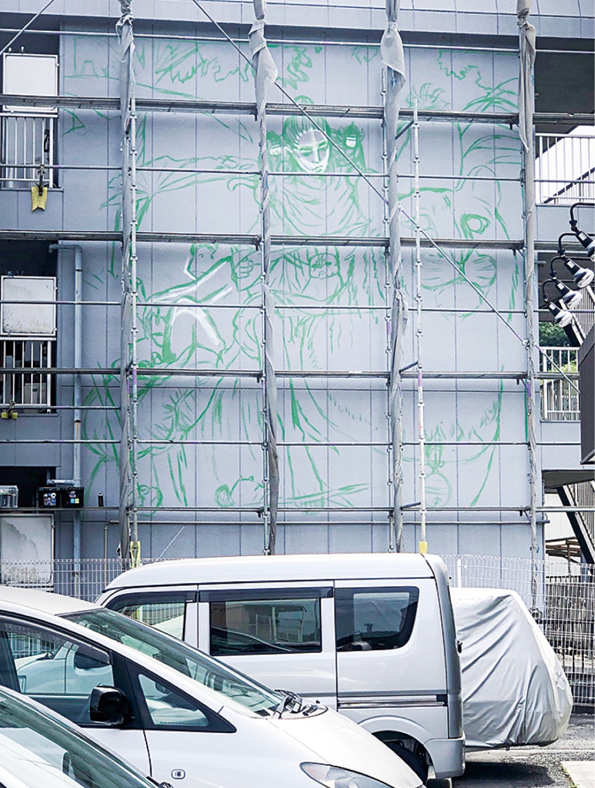 今回ケンスケさんに発注した建物オーナーの英(はなぶさ)竜史さん(多摩市在住)は、アパートからおよそ500mという近隣に多摩美術大学があることから当初、学生から参加を募り壁面に絵を描いてもらおうと考えた。2019年のことだった。