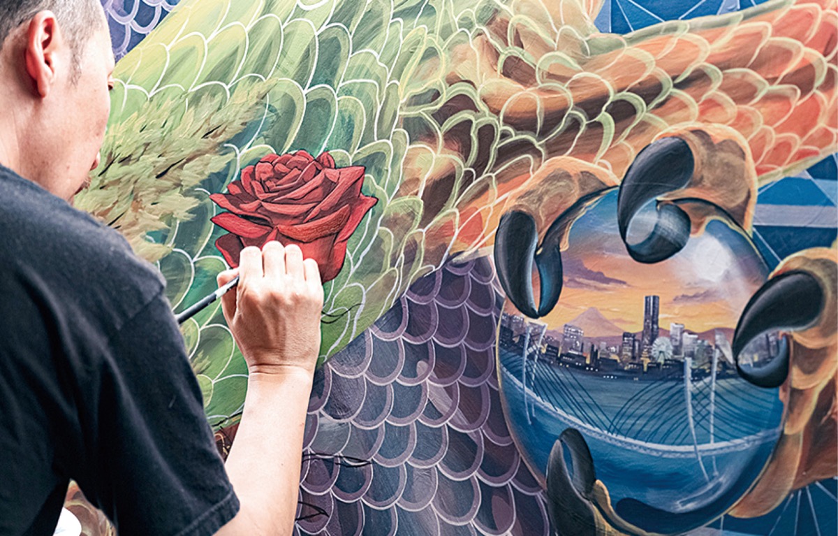 ケンスケさんは大型壁画を中心に飲食店舗内壁画、企業や行政へのアートワーク提供などを手掛けている。