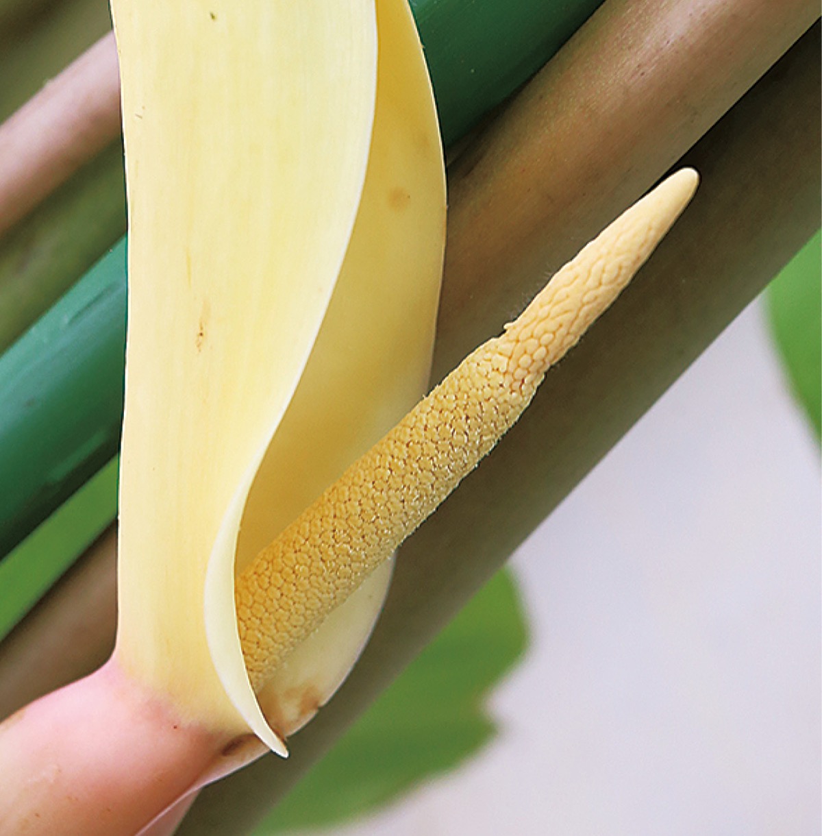 感染症対策として勤務日数を減らしたことから、家庭菜園に力を入れ始めたという大蔵さん。「特に肥料をあげたわけでもないのに咲いてびっくり。ネットで調べても、やはり珍しいみたい」と話す。品種は「赤芽」。「開花は数十年に1度」ともいわれており、高温多湿の状態が続くと開花するという説もある。