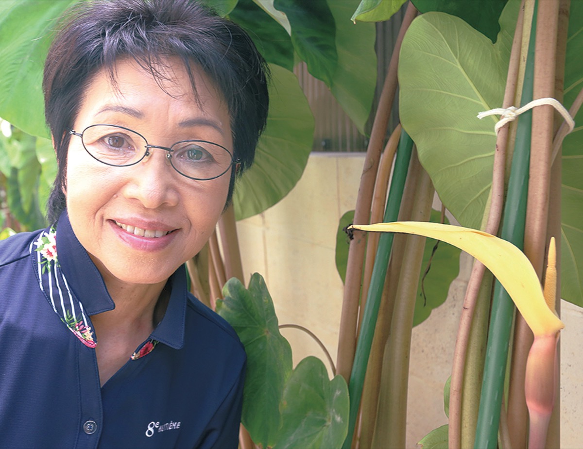 珍しいとされる里芋の花が中野町の大蔵澄子さん宅の家庭菜園で開花した。大蔵さんによると「8月19日に気づいた」という。