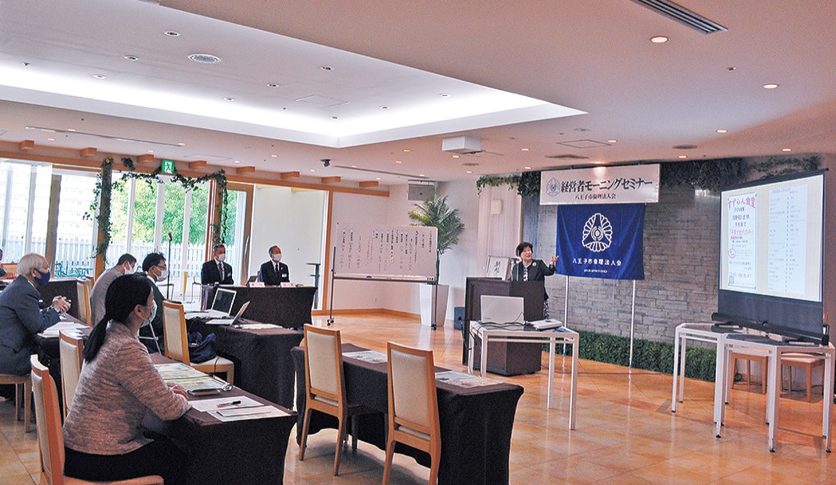 毎週金曜日の早朝6時25分にある勉強会「モーニングセミナー」では市内を中心に活躍する経営者や医療従事者らを講師として会場である八王子ホテルニューグランド(大和田町)に招き、参加者の知見を広げている。10月15日の回では元市議で現在は中野山王にあるこども食堂を運営する小林鈴子さんが登壇=写真。コロナ禍における食堂の現状や子育て家庭との関わりについて熱く語った。
