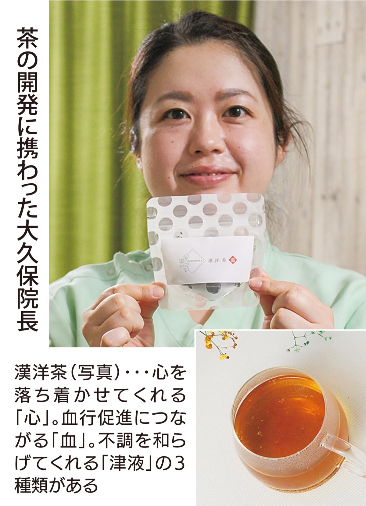 大久保聡子院長は「女性のためにつくった香り良く飲みやすいお茶。息抜きの際のお供にしてもらえれば。もちろん、男性もどうぞ」と話している。鍼灸や漢方、ヨガなどで女性の健康サポートにあたる同院は今月まで、3周年キャンペーン中という。