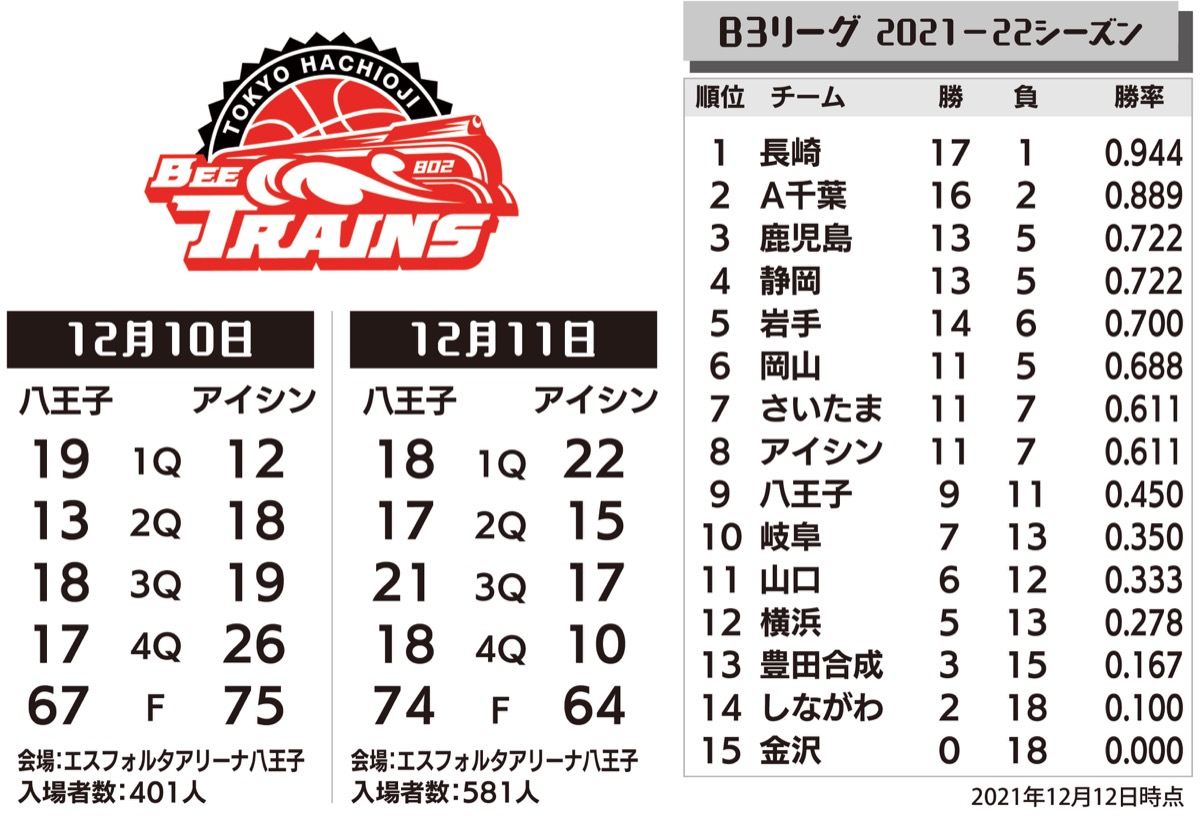 プロバスケB3東京八王子ビートレインズは12月10日、11日、狭間町にあるエスフォルタアリーナ八王子で岩手ビッグブルズと戦い1勝1敗だった。
