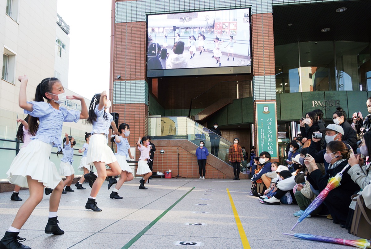 当日は、近隣にあるスガナミ楽器ヤマハ音楽教室南大沢センターのジャズダンスクラスの生徒がダンスを披露した。流行りの楽曲に合わせた軽快なダンスが始まると、その様子がビル壁面に設置される大型サイネージにも映し出され、100人ほどが見入っていた。
