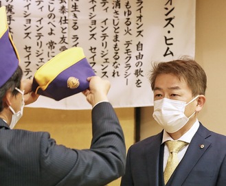 この日は、通常は新年例会の中で行わない入会式も行われた。昨年7月から始まった今期で6人目の入会があり、新入会員の上林章記さんは厳粛な雰囲気の中で入会の誓いを立てた。
