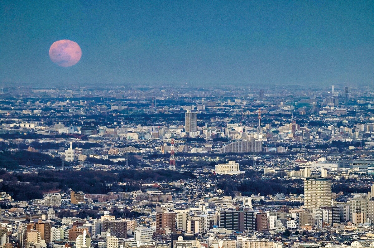 樋口さんは2013年9月から毎月、高尾山かすみ台展望台で満月を撮り続けている(年に13回のときも)。樋口さんによると今年のように水平線上の昇りたてが奇麗に撮れるのは「天候に左右されますので年2、3回ほどしかありません」とのこと。「大抵はモヤが多く、写真のような低い位置の赤く大きい満月は撮れません。この日は多少モヤも有りましたが、大気が澄んでいて綺麗に見えました」