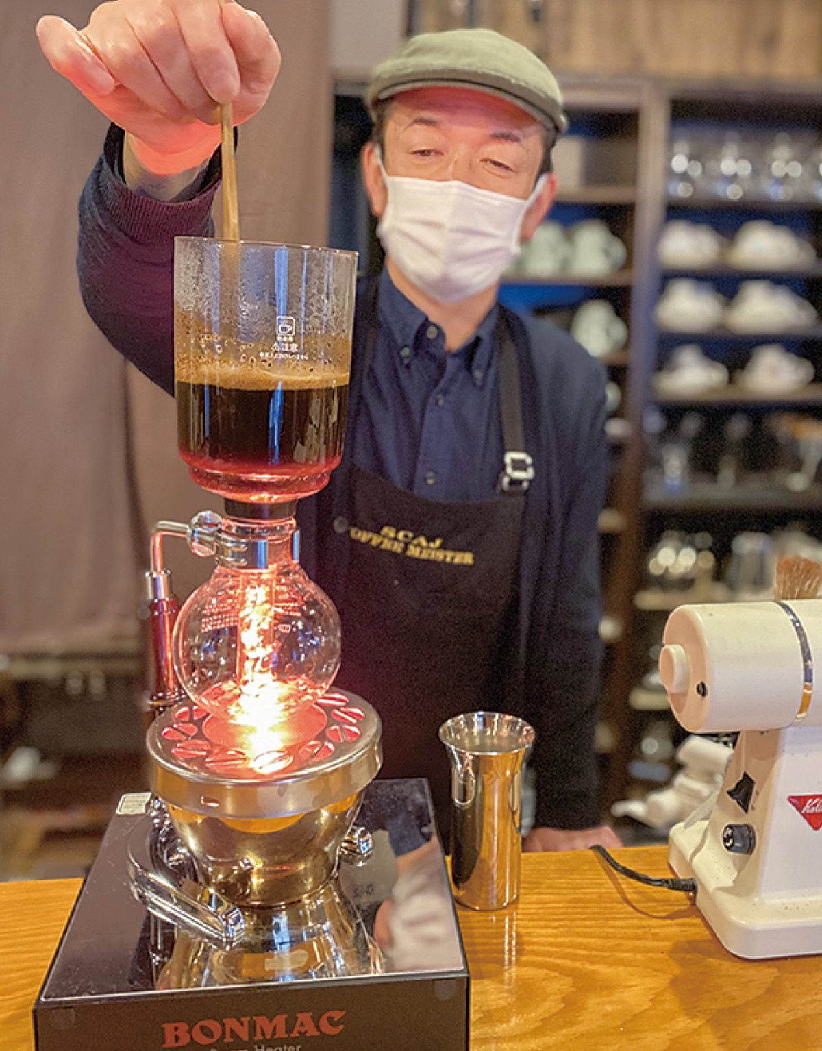 生豆を自分の目で確かめ、良い状態のもののみを選ぶ。サイフォン式は安定した味を求めた結果であることと出来上がりを待つ人に「見た目を含めたコーヒータイムを過ごして欲しい」という思いから。その一杯一杯は小笠原さんの結晶のよう。「コーヒーと料理でゆっくりいい時間を」
