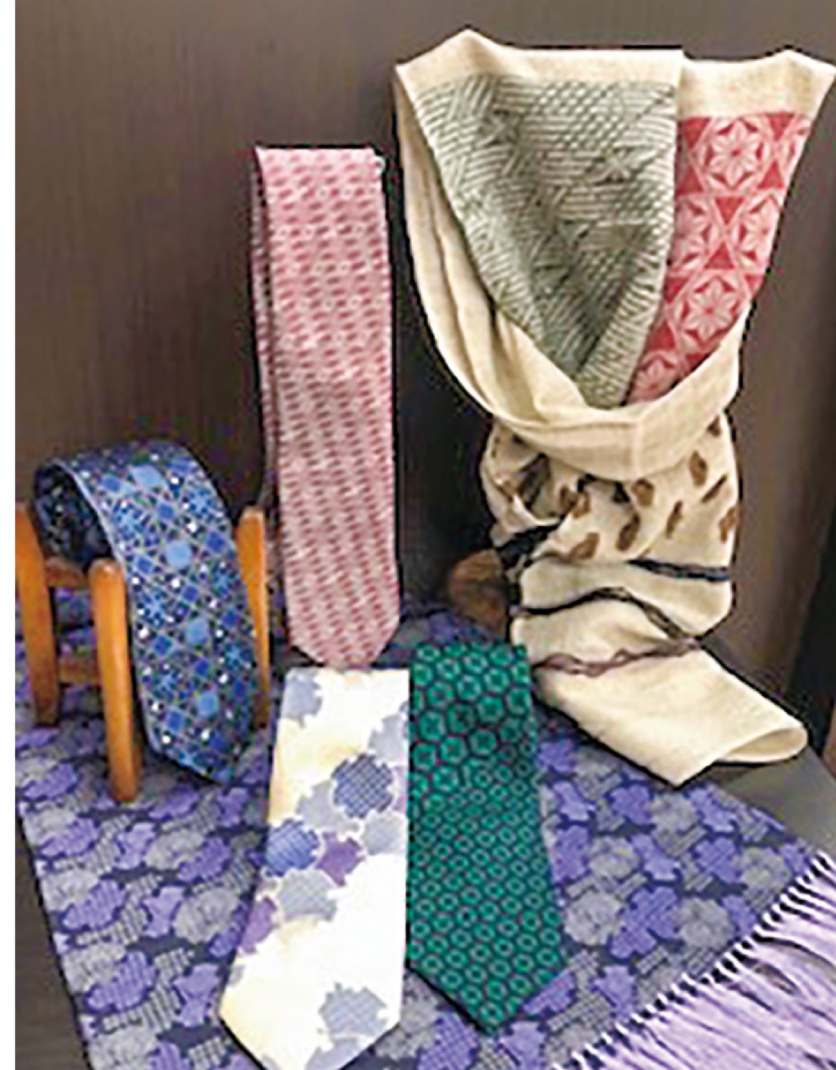地元で生産されたネクタイ、マフラー、ストール、ネクタイ型のアクセサリー「ピータイ」などが豊富に展示される。学生コンペ(2021マルベリー・シティー ネクタイデザインコンペ)で入選したネクタイとストール・マフラーなども。