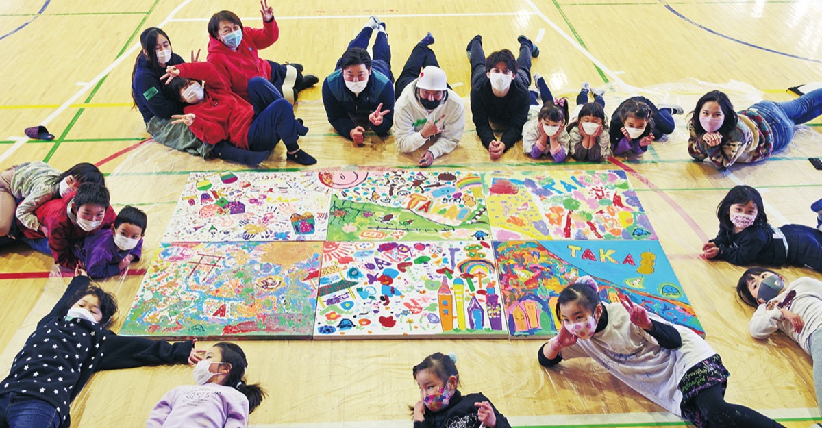 講師に招いたのはアーティストのGaku(五十嵐岳)さん。6分割したキャンパスにGaku さんが下絵「高尾のまち」を描き、参加した子どもたちが自色付けして作品を完成させた。
