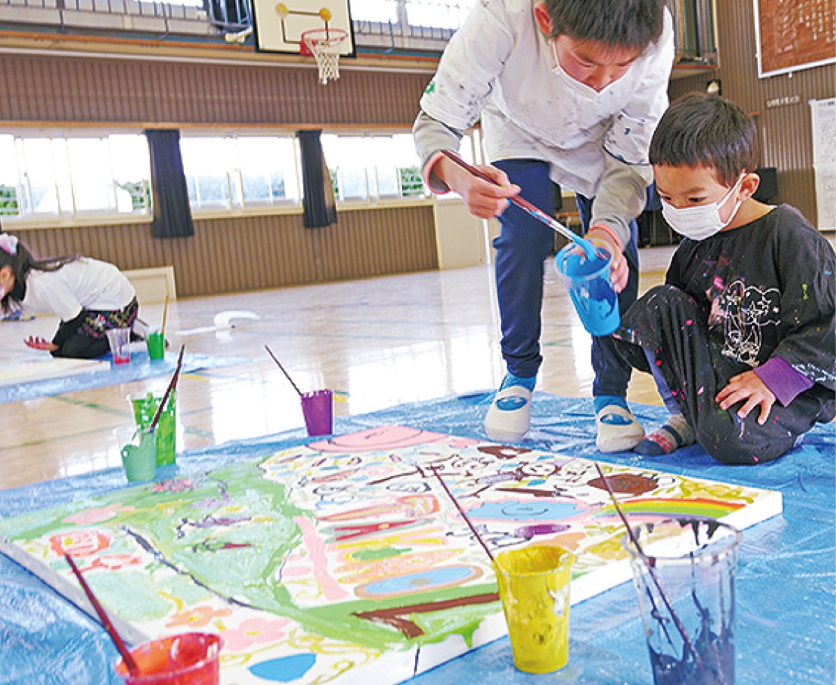 浅川小出身の塚田拓さん(30)と佐藤新平さん(30)が企画したアートのイベントが1月29日、同小体育館(初沢町)で開催された=写真。
