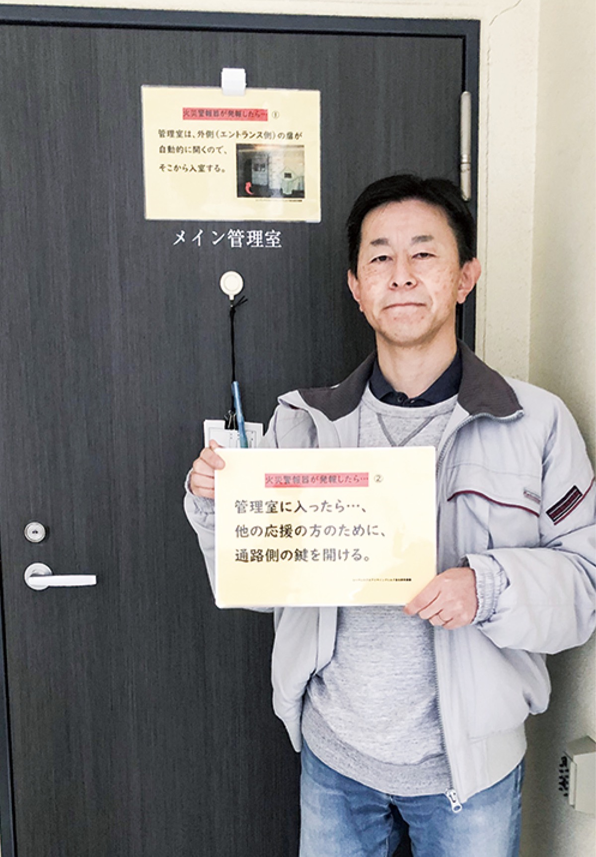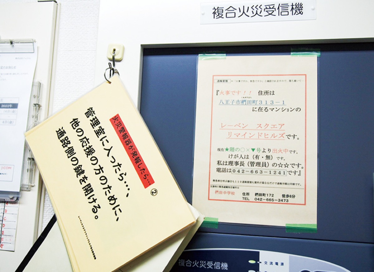 同マンションの管理室扉には指示カードが掲示されている。入室すると「【2】管理室に入ったら他の応援の方のために通路側の鍵を開ける」など、次の指示が警報受信機側に掲げられている。