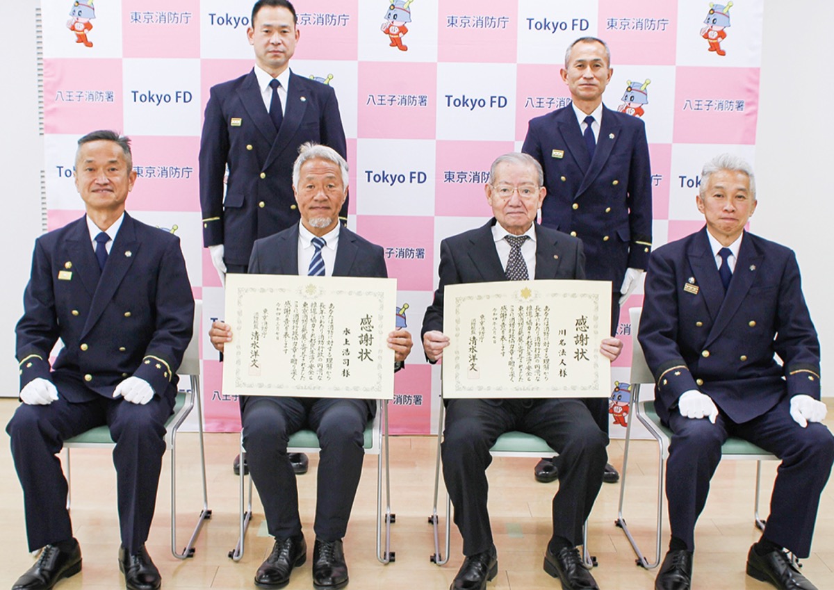 この表彰は、長年に渡る消防行政の発展、消防業務の推進に貢献し、その功労が他の模範になる人に贈られる。表彰を受けたのは八王子消防懇話会の川名法人会長と八王子防火管理研究会の水上浩司会長。