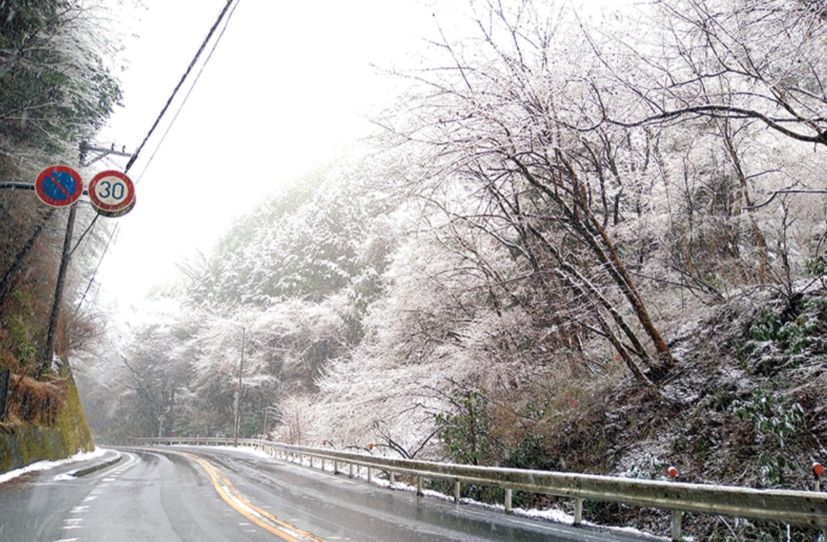 市街地では植栽や建物の屋根が薄っすら白くなる程度だったものの、神奈川県との都県境にあたる大垂水峠では、道路上にもわずかに雪が残り、木の枝についた雪が、開花した桜の花のように見える箇所もあった=写真。