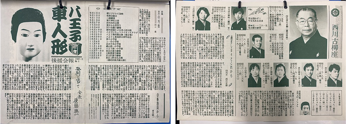 八王子車人形後援会は昭和60年(1985)10月12日、西川古柳座稽古場(下恩方町)のこけら落としを機に発足しました。