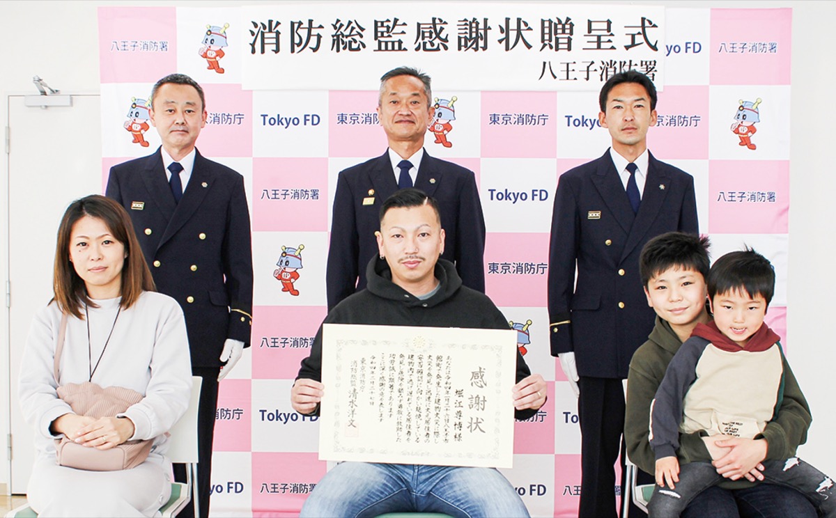 八王子消防署は2月27日、火災現場における人命救助の功績で、市内在住の堀江尊博さんに消防総監感謝状を贈呈した=写真(同署提供)。