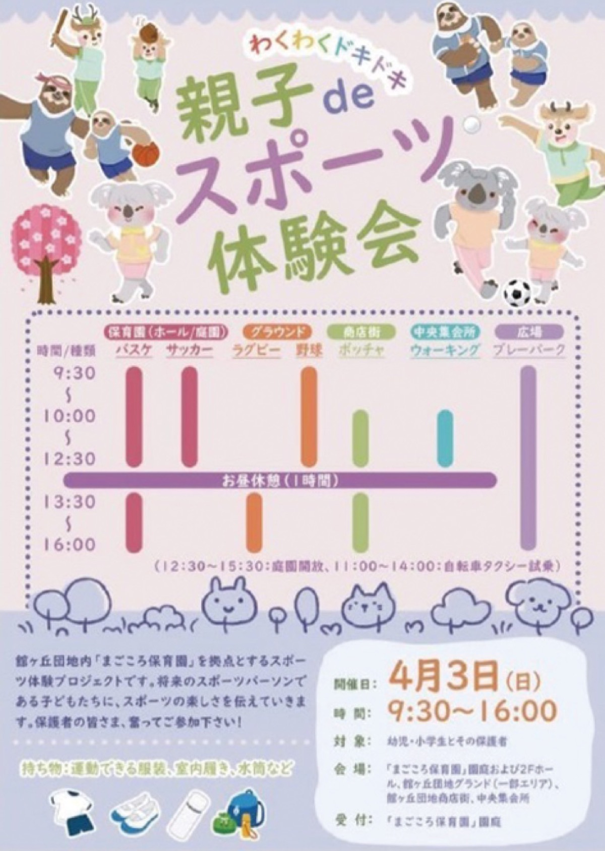館ヶ丘団地内(館町)のまごころ保育園を拠点とする「たて団スポーツ体験実行委員会」による「親子deスポーツ体験会」=画像=が4月3日(日)に開催される。同園などで午前9時30分から午後4時まで。対象は幼児小学生とその保護者。