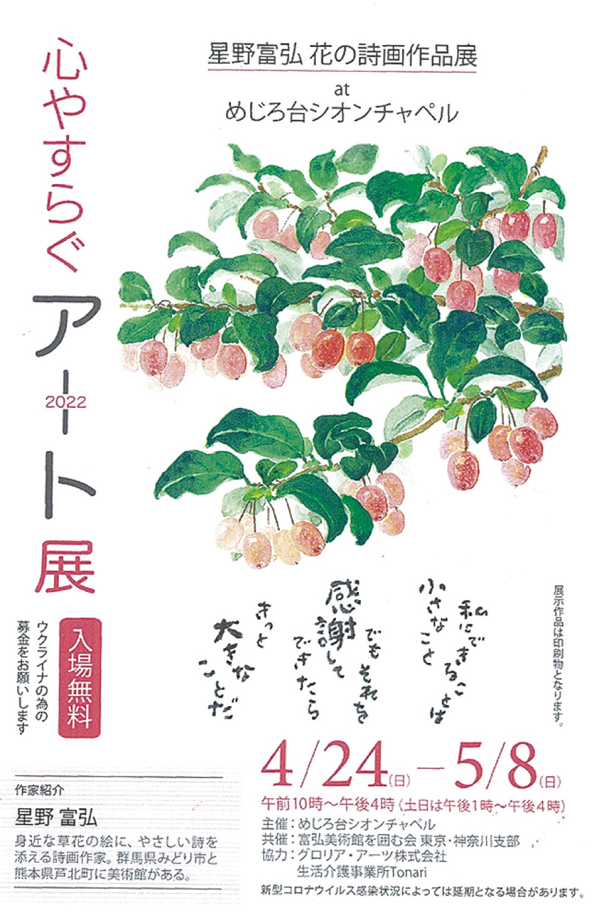 めじろ台シオンチャペルは4月24日(日)から5月8日(日)まで、詩画作家・星野富弘さんの印刷物による作品展を開催する。午前10時から午後4時まで。入場無料。