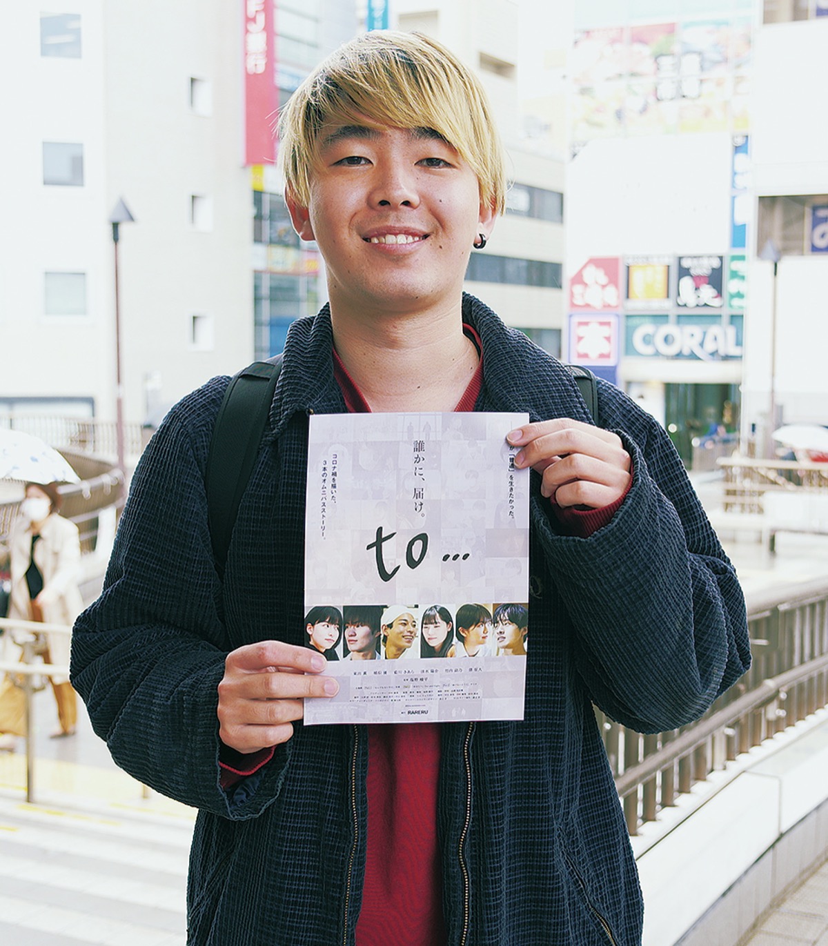 八幡町出身で中央大学(東中野)を昨年卒業した映画監督、塩野峻平さん(23)が手掛けた映画作品「to...」が、「池袋シネマ・ロサ」で4月30日から1週間上映される。コロナ下で感染することもなく、日常を送る「端の人」のもどかしさと希望を描いている。
