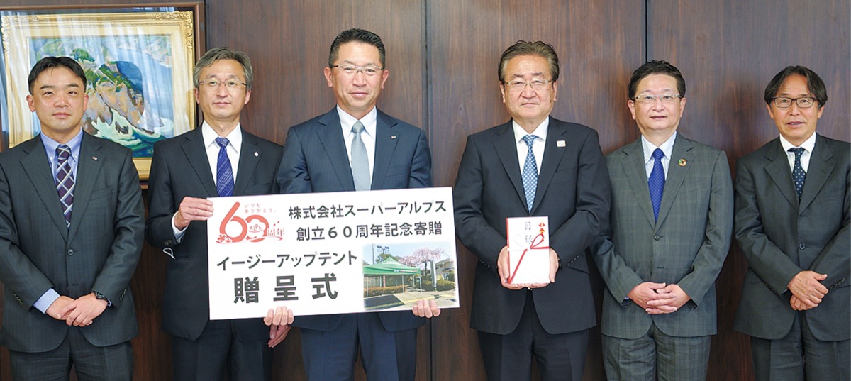 今年、創立60周年を迎えた(株)スーパーアルプス(滝山町)が4月22日、周年事業の一環として、八王子市社会福祉協議会へ設営が簡単なテント5張りの寄付を行った。市社協は、寄贈されたテント5張りを災害ボランティアセンターなどに活用していくという。
