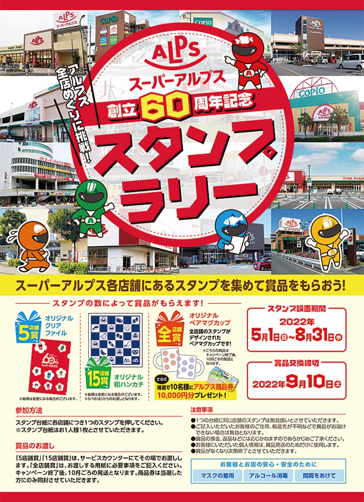 今年60周年を迎えた(株)スーパーアルプス(滝山町)は、同社が展開するスーパーマーケットをめぐると景品がもらえるスタンプラリーを実施している。8月31日(水)まで。