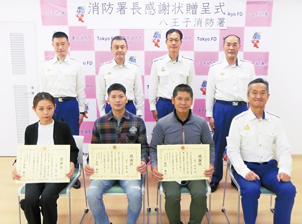 八王子消防署は5月17日、火災を発見し、初期消火に努めた3人に同署で八王子消防署長感謝状を贈った。感謝状を受けたのは関澤飛鳥さん、大森鈴乃さん、関澤啓二郎さんの3人。