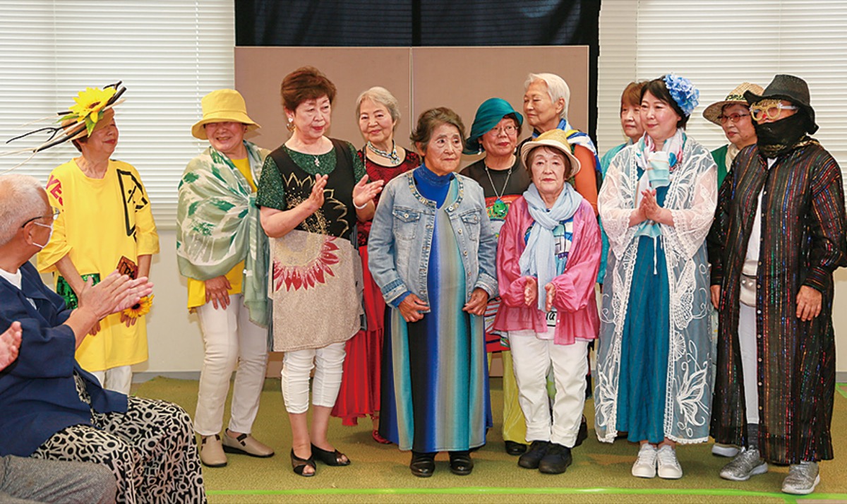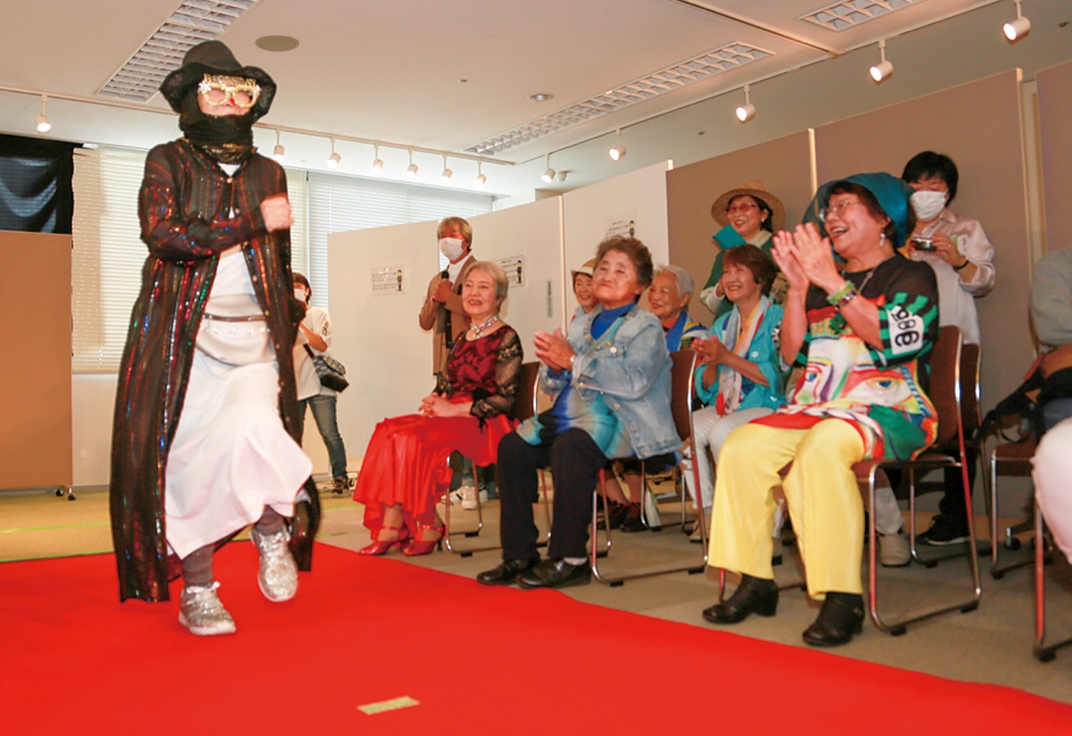 年配者たちに元気になってもらおうと、生活支援を担う打越町の団体「ハモニカ」による「うきうきファッションショー」が5月22日、北野市民センターで開催された。同団体の関係者で参加した女性12人がモデルになり、男性6人がエスコート役を務めた。