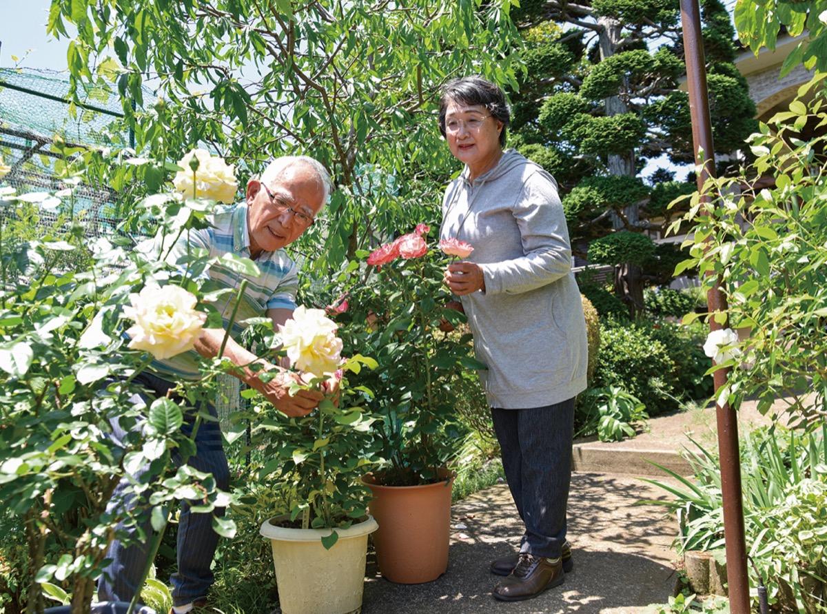 赤、黄、ピンク、色とりどりのバラは70鉢、ざっと30種類以上。アジサイやダリア、モッコク、キンモクセイ、サザンカにスイセン--。暁町に住む木下照一さん(79)と祥子さん(76)=写真=が家庭園芸に傾注する、40坪ほどの庭が舞台だ。草花や花の咲く庭木に、ブドウやデコポンといった果物も加え、四季折々の植物を丹精込めて育てている。