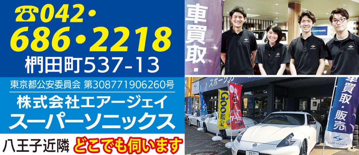 「『廃車にはお金がかかる?』いいえかかりません」。転居や免許返納で乗らなくなった車の処分は、高価車買取で話題のスーパーソニックスに相談を。素早く親切な接客が評判。丁寧な対応は店主の車に対する深い愛情の表れだ。どんなに古い車も最低価格3万円(普通車)〜。引き取りや面倒な手続きも全て同店にお任せ。手数料も負担してくれる。「下取りや廃車する前にご相談を」