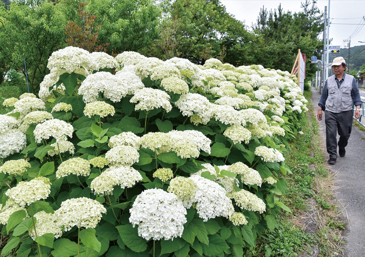 昔から花が好きで、40代のころ室内で種から花を栽培したことも。15年ほど前、たまたまもらったアナベルを育てることに。「アジサイは咲くまで4、5年。手間もかかるが、アナベルは1年で開花する。育てやすくて増やしやすいから」。それでも、年間を通じて草刈りや剪定などの手入れは欠かさない。秋川街道の歩道沿いをはじめ、農道や川口川の岸辺にも植栽。私有地は地権者の許可をもらいながら、花を育成するようになった。