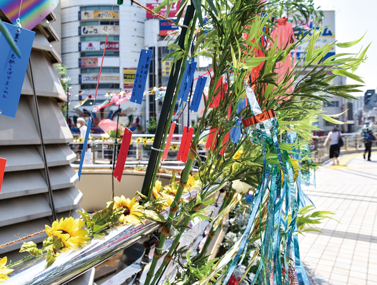 八王子駅北口商店会(清水栄会長)は今年も、恒例の七夕飾りを駅前マルベリーブリッジで展開=写真。7月12日まで設置している。