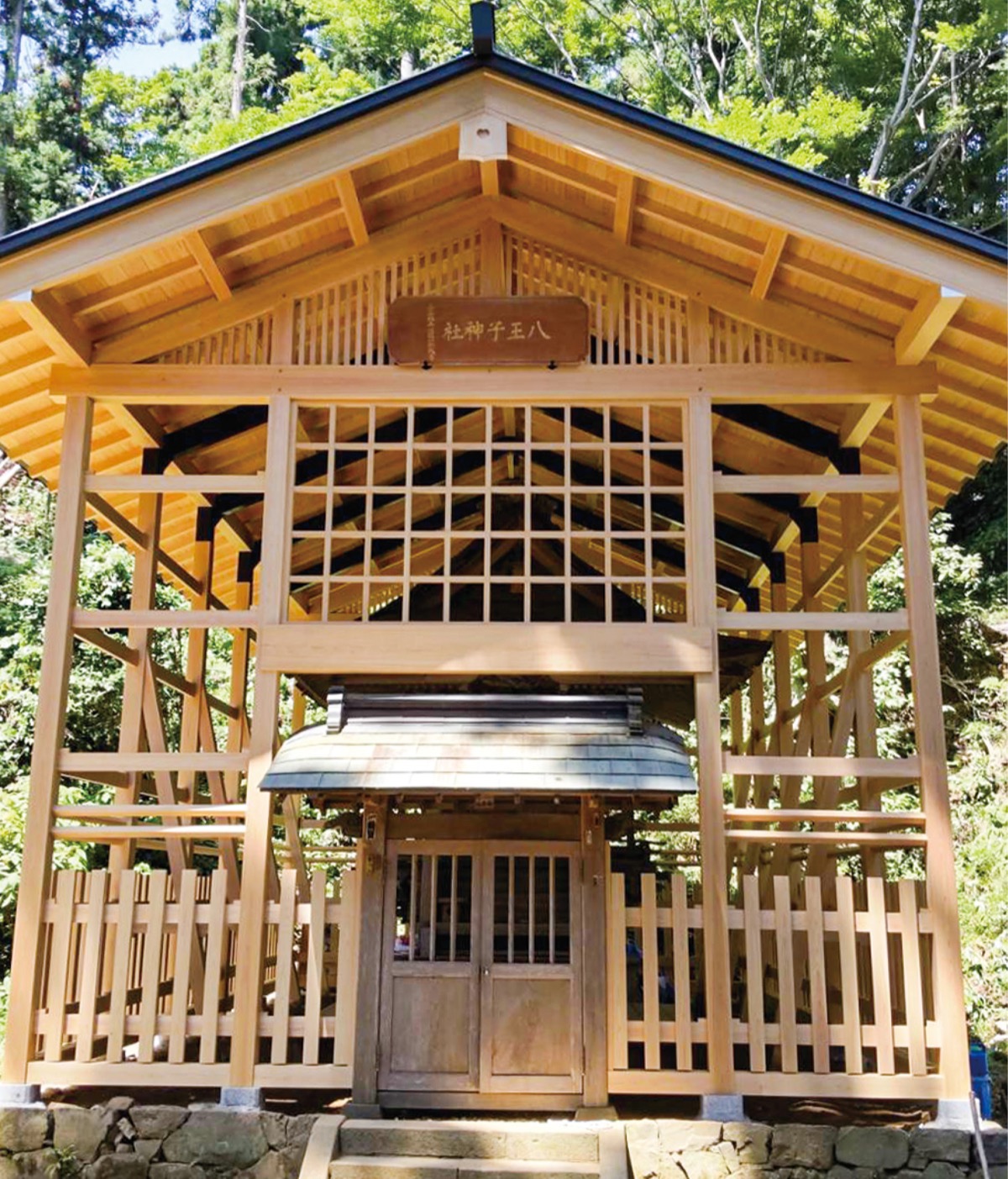 同神社は、標高約460メートルにある八王子城跡の頂上に鎮座する。工事を請け負った(株)吉匠建築工藝は、資材約30トンを麓の「御主殿跡」から頂上まで、ヘリコプターで33往復にわたり運搬。約4カ月間かけて覆い殿を建て替えた。