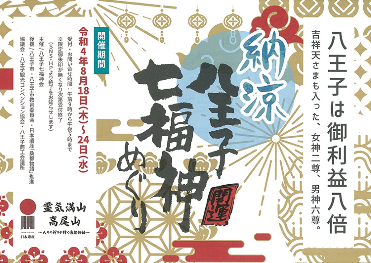 期間は8月18日(木)から24日(水)まで。「納涼八王子七福神めぐり限定御朱印」(1900円)を500部限定で販売する。限定御朱印購入者には提灯を進呈。浴衣、甚平、着物着用の人や中学生以下、同会のLINE登録者を対象にオリジナル扇子の特典も1000本限定で用意されている。詳細は同会ウェブサイト。