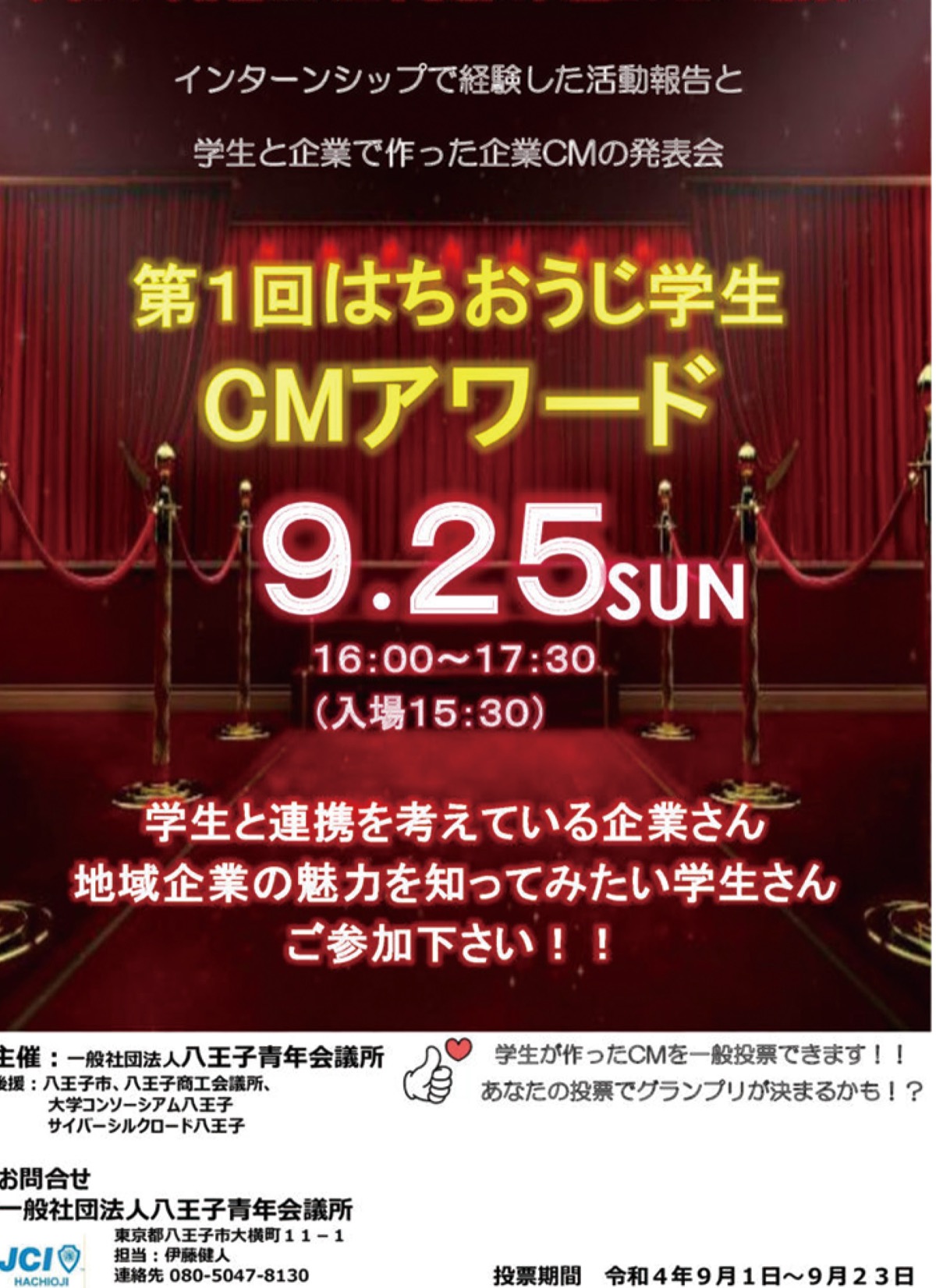 一般社団法人八王子青年会議所(JCI)が主催する「第1回はちおうじ学生CMアワード」の一般投票の期限が9月23日に迫っている。