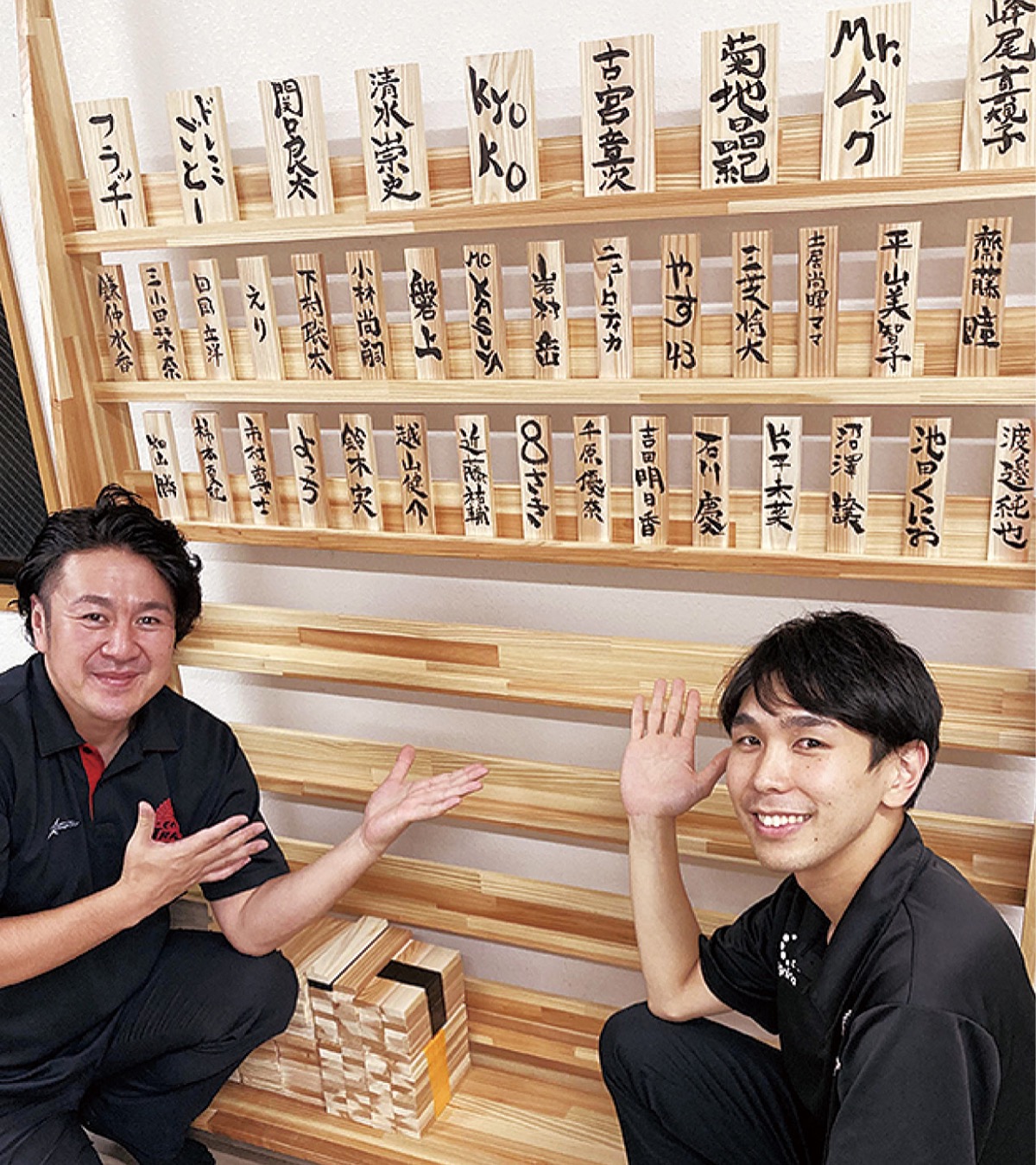 木札と掲示用フレーム=写真=は、クラブのスポンサー・瀬沼木材(株)(瀬沼庄次郎社長/大楽寺町)が素材からデザイン・製作まで協力。木札の氏名は、クラブ運営会社のマネージャー・沢登敏也さんが感謝を込めてしたためている。
