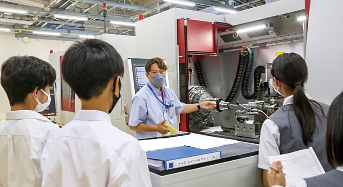 総合的な学習の時間を活用した、同校の「八王子市内めぐり」の一環。コロナの影響もあり、同社が小中・高校の児童や生徒を受け入れるのはおよそ3年ぶり。工場内では、歯車が刻まれる前の金属など、生徒たちは普段目にする機会のない光景に見入っていた。