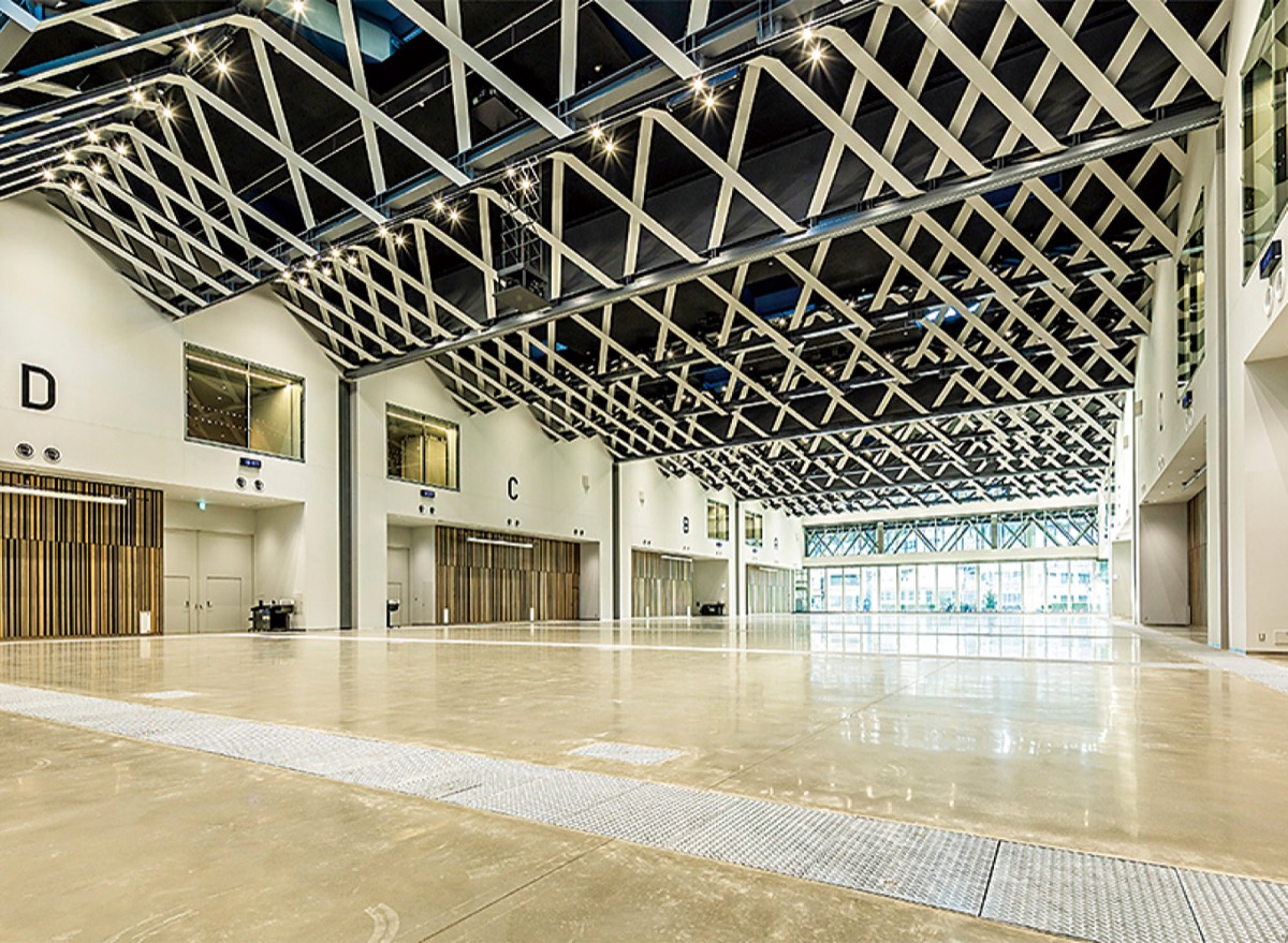 最大約2400平方メートル、天井高10メートルの1階展示室は2千人を収容。都心でしか実現できなかった大規模イベントも開催できる。大小7つの会議室は、研修やセミナー、面接会場など多様な用途を想定。同施設では催事の開催や運営を幅広くサポートするとし、産業振興への貢献を掲げている。