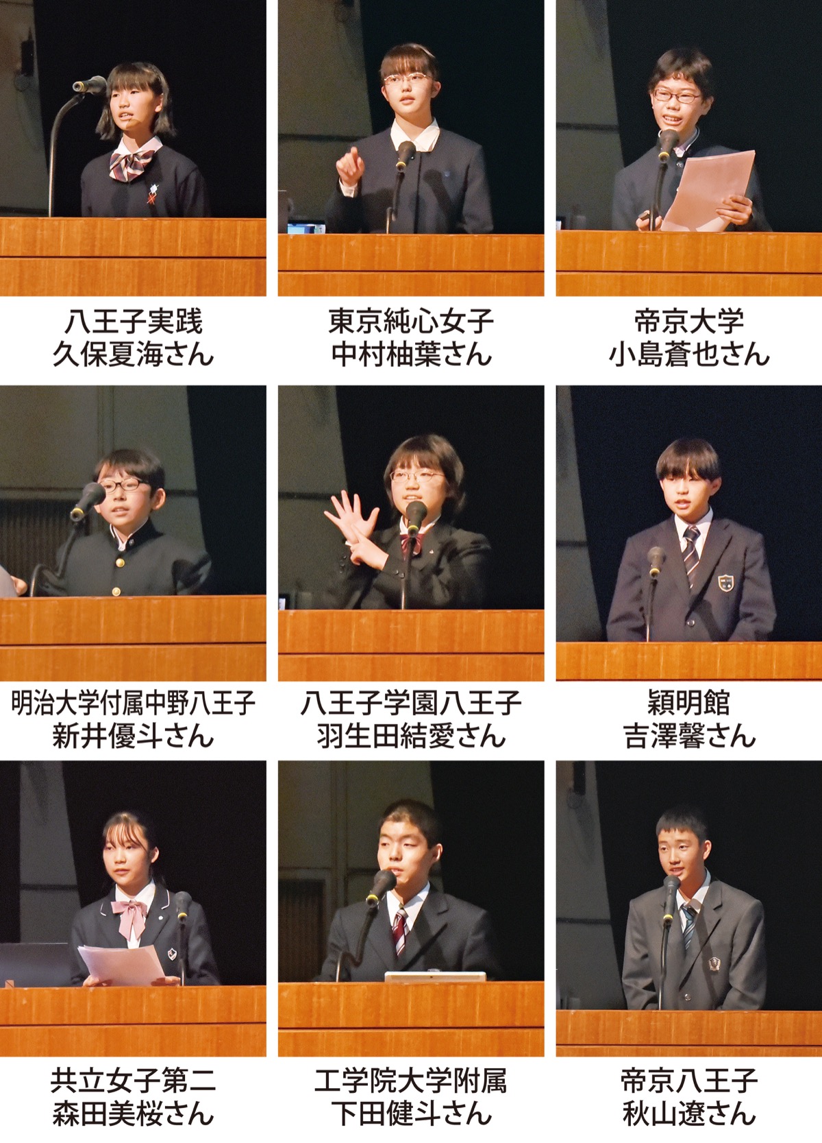 11月5日に八王子市で行われた、市内の私立中学校9校による発表会「八王子市私学プレゼンテーションコンクール」。学校名、発表した生徒名(カッコ内は出身小学校)、テーマと審査結果は以下のとおり。