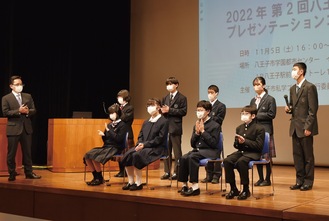 八王子市内の私立中学校9校の中学1年生による合同発表会「八王子市私学プレゼンテーションコンクール」(プレコン)。第2回の発表会が11月5日、学園都市センター(旭町)イベントホールで行われた。各校の代表生徒1人がそれぞれのテーマで6分程度、壇上で提言や思い入れなどを語った。