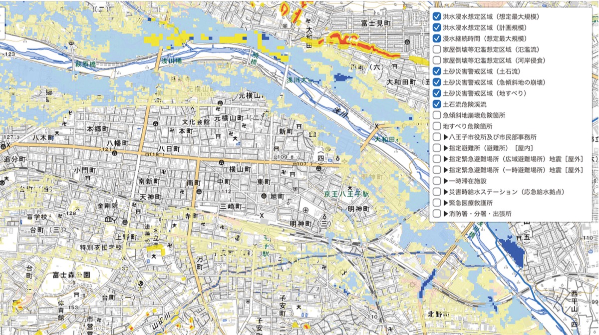 八王子市は、これまでウェブ上でPDFのみ公開していた市のハザードマップをデータ化。「OSS版八王子市防災マップ」として11月から市サイトに掲載している。