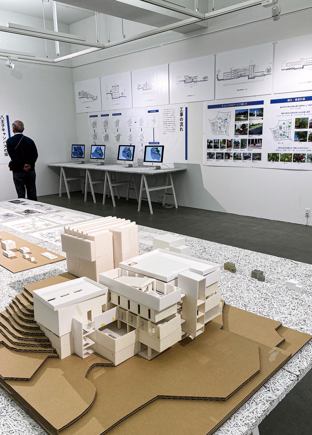同展の副題は「八王子キャンパスの半世紀」。土地購入から62年経過したことや、敷地全体の設計を手がける田淵諭同大学教授が今年度で退職するため企画された同展。キャンパス整備の工程を振り返った写真や映像のほか、設計中の各棟のスケッチや模型などが展示されている。