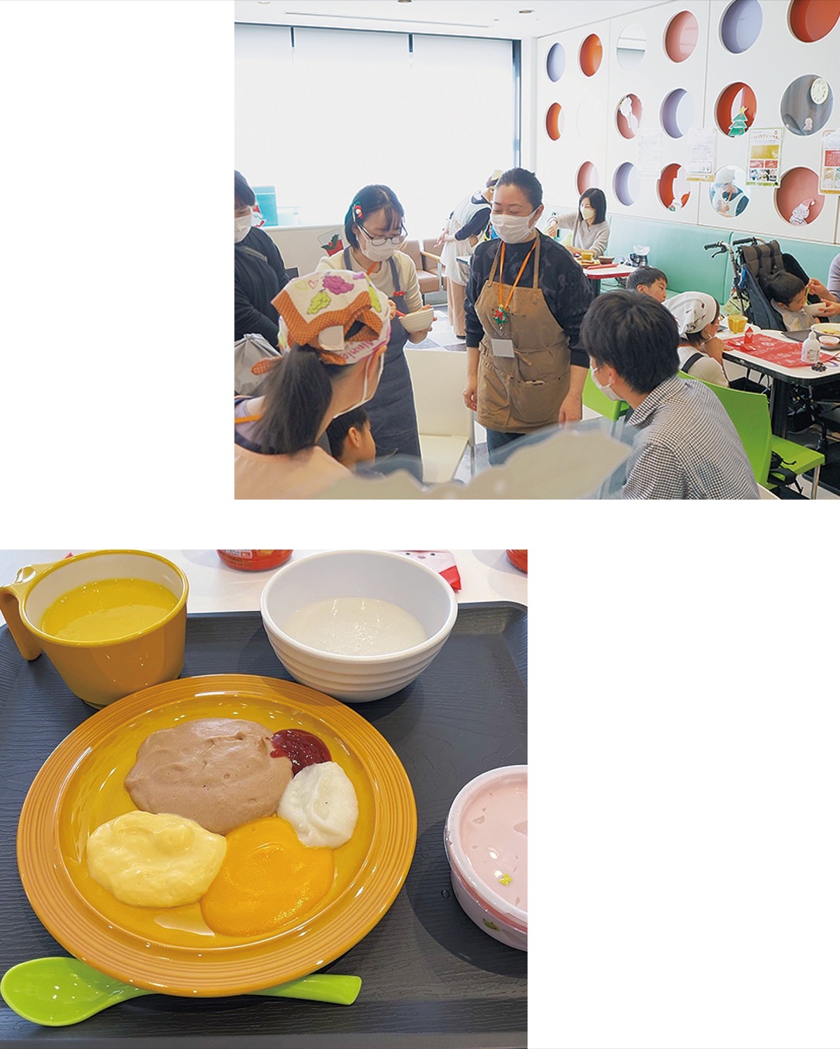 医療的ケア児は一般的な外食が難しい点から、同法人が企画。当日は9組の家族が参加した。「家族と同じ食事を食べる」というコンセプトで、保護者と同じメニュー内容の食事が流動食でふるまわれた。