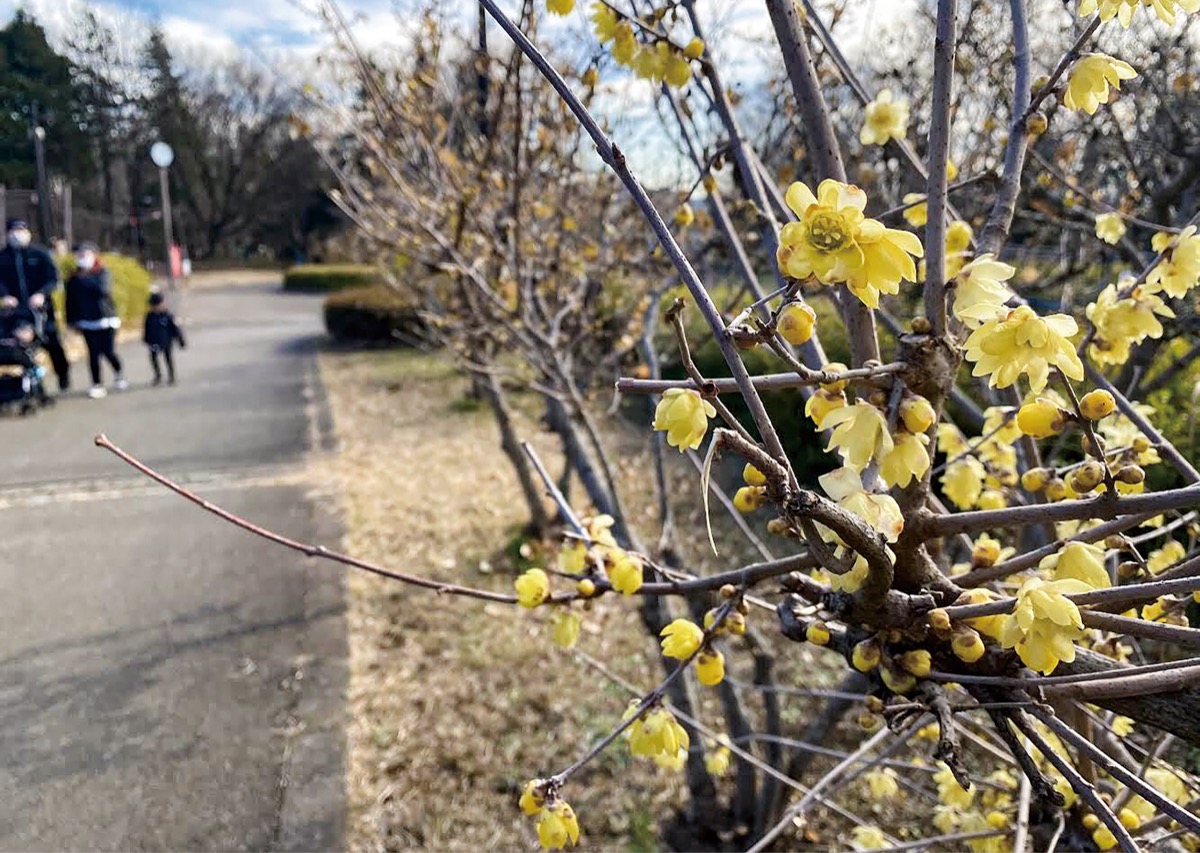 東京都立小宮公園(暁町2の41の6)では今月に入ってから、「ソシンロウバイ」が春の訪れを告げている。
