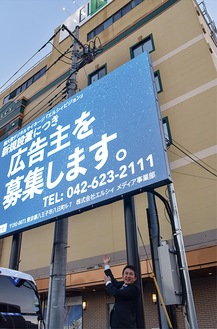 「八王子の企業を応援したい」と、地域貢献を掲げて格安の料金設定で始めたという取り組み。「エルシィビジョン」と称したこの看板の大きさはおよそ縦3メートル、横5メートルほど。動きのある映像の広告を流すことができ、1枠あたり15秒で募集枠は30枠分を用意しているという。